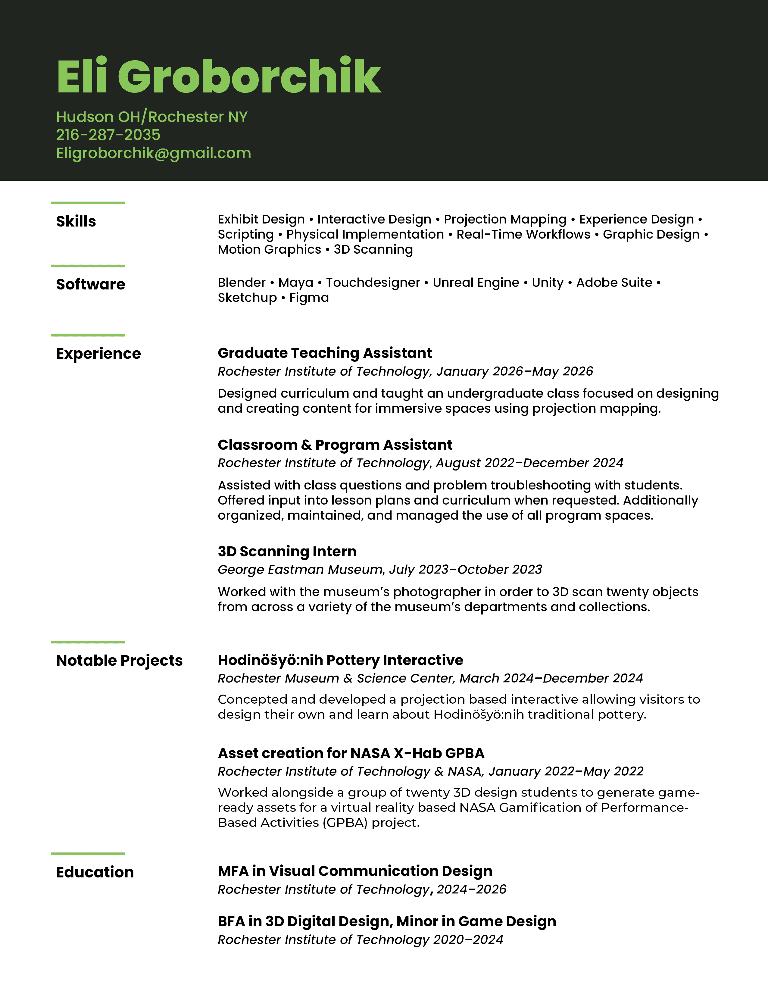 I'm currently an MFA Candidate at Rochester Institute of Technology in visual communication design, with a BFA in 3D digital design from the same university. My work focuses on enhancing museum experiences through modern visualization techniques, designing immersive exhibits, and interactive installations. My passion for awe inspiring educational experiences has lead me to work closely with institutions such as: Rochester Museum and Science Center, The George Eastman Museum, and Genesee Country Village & Museum.