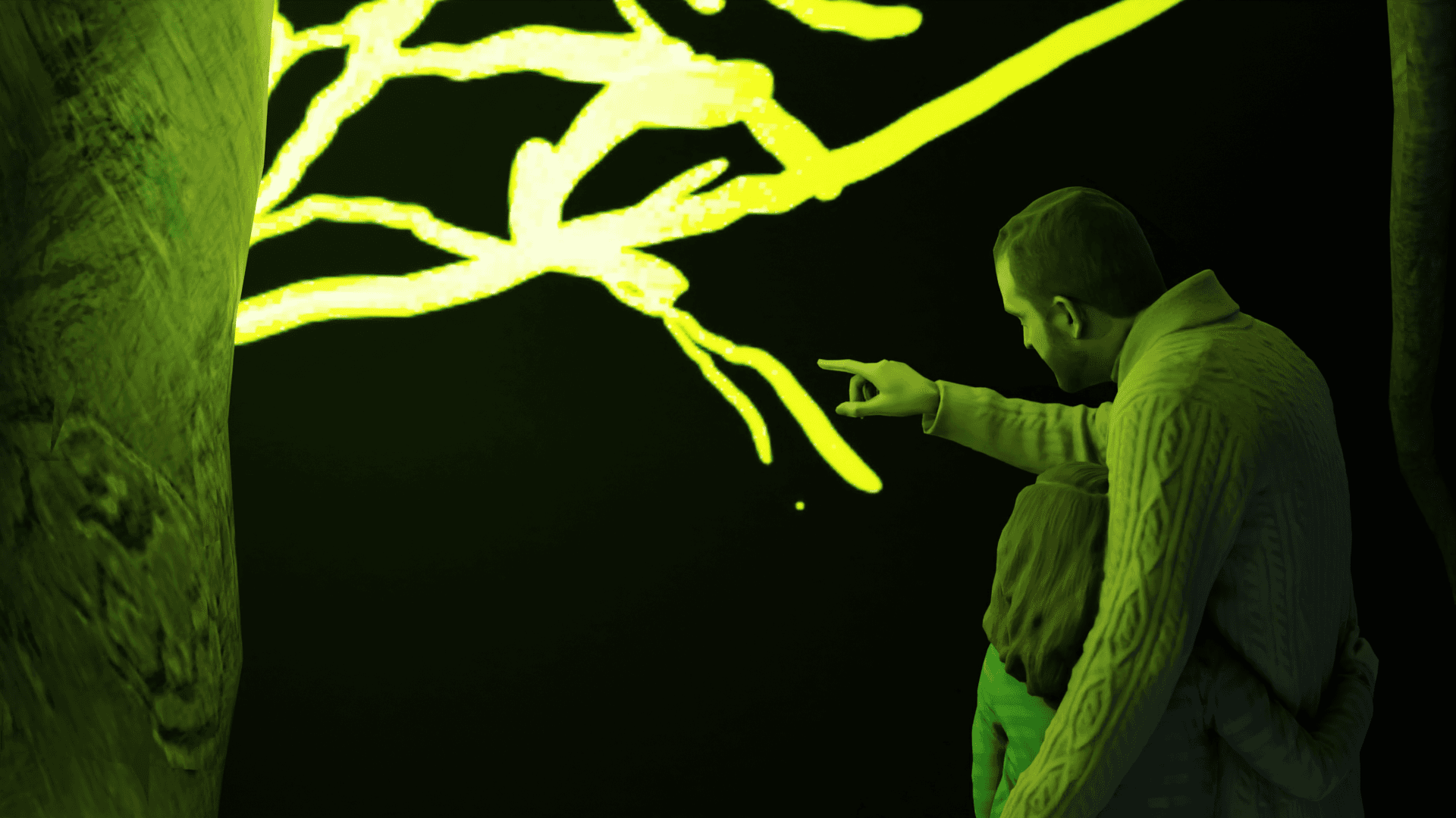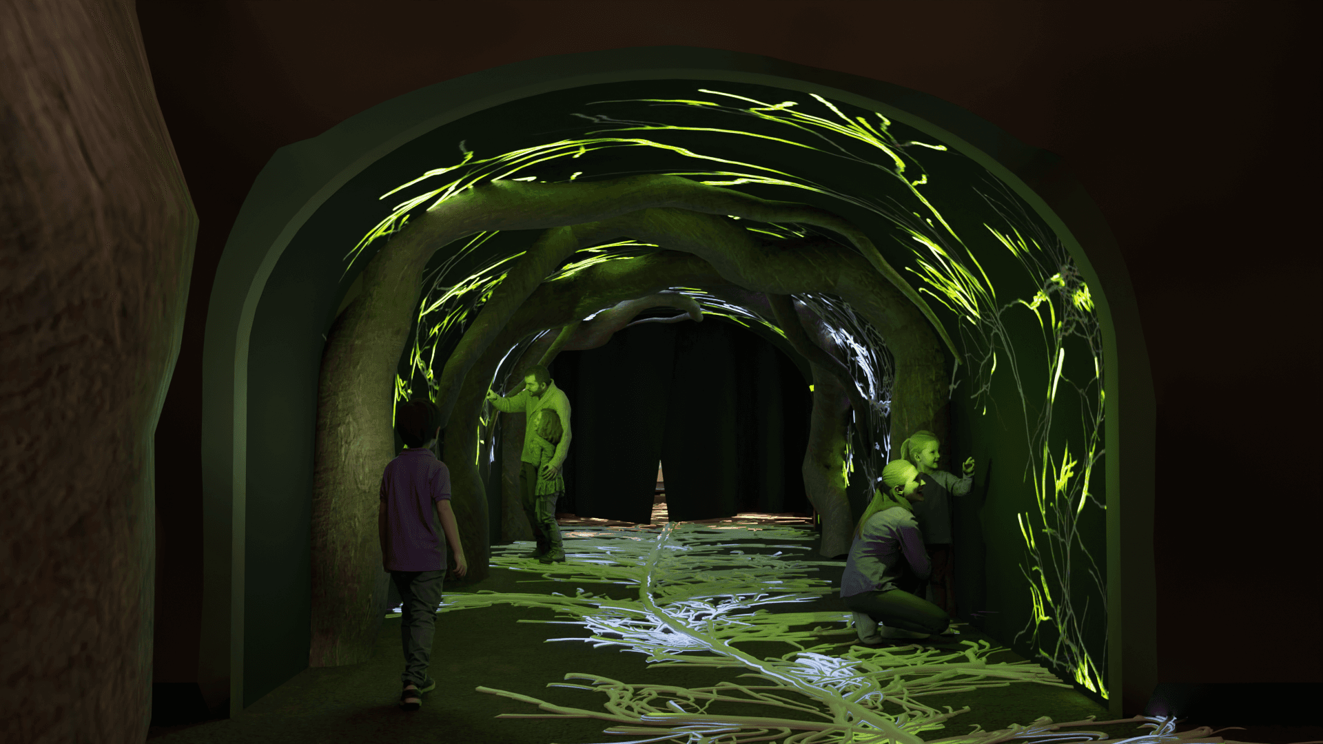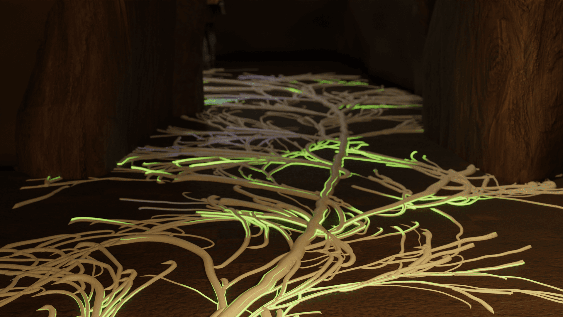 Shrinking visitors down even smaller, they get to explore an underground world of growing mycelial networks. Nutrients represented by vibrant glowing displays traveling transporting nutrients back and forth. A compelling transition connecting mushrooms with their mold counterparts.