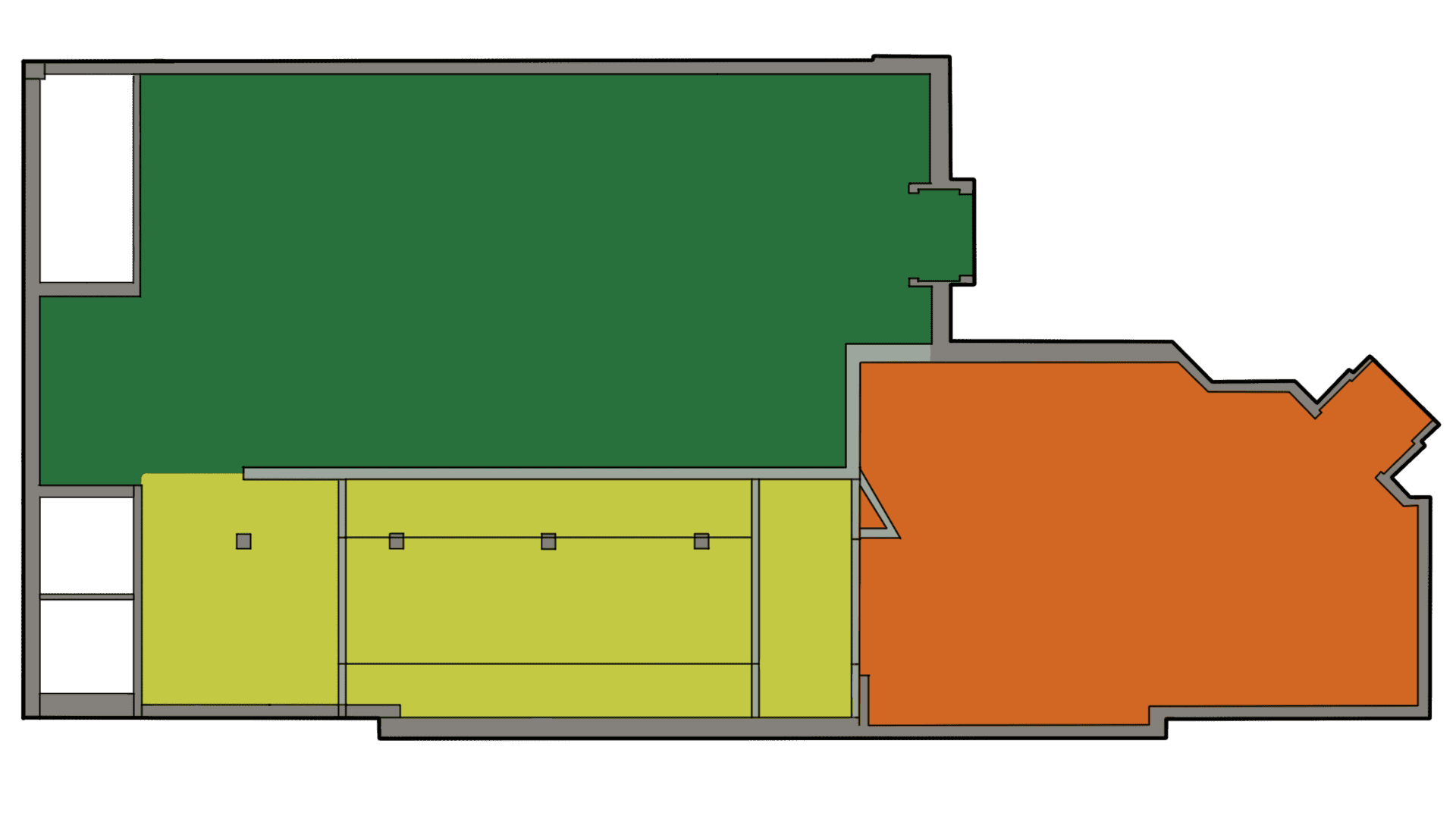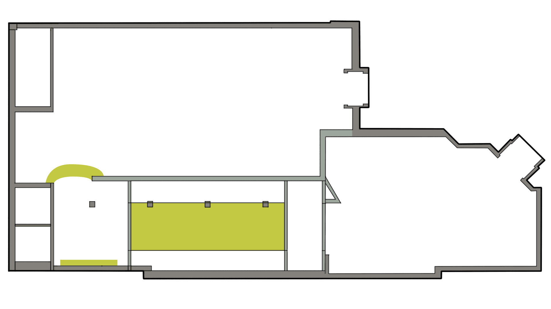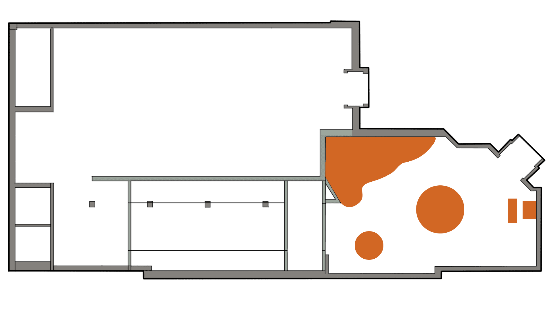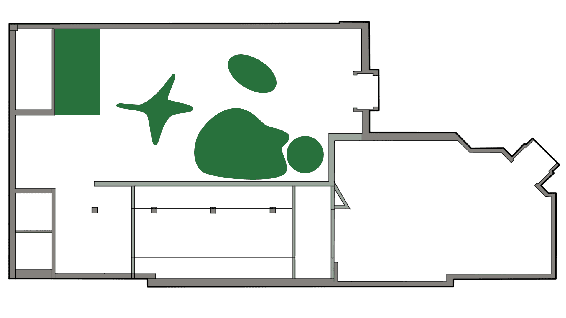 Though the gallery is great as one open space, I wanted to constrain the space a bit by utilizing temporary walls. This was to focus the viewer into three independent sections and increase immersion by forcing the viewer closer to each element.