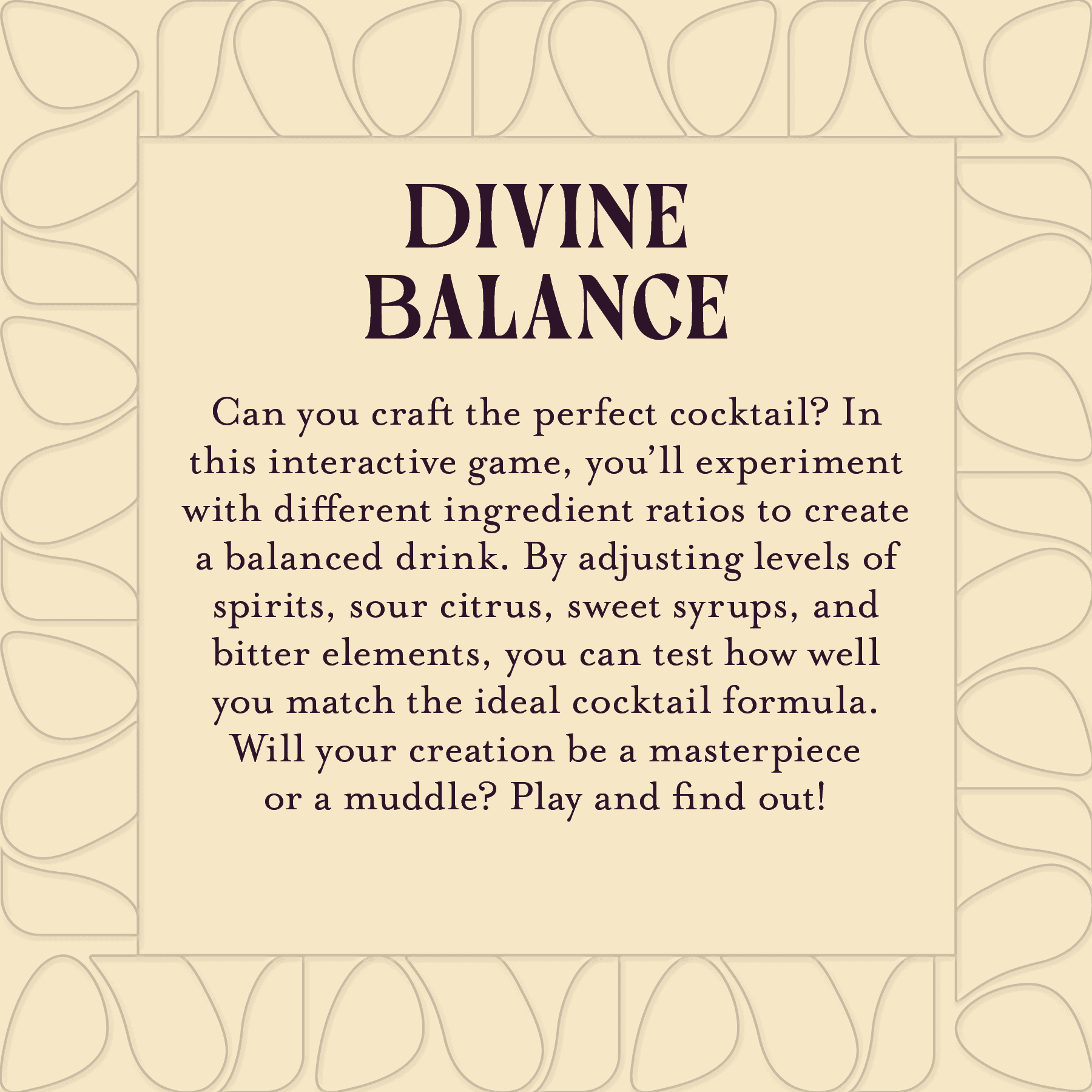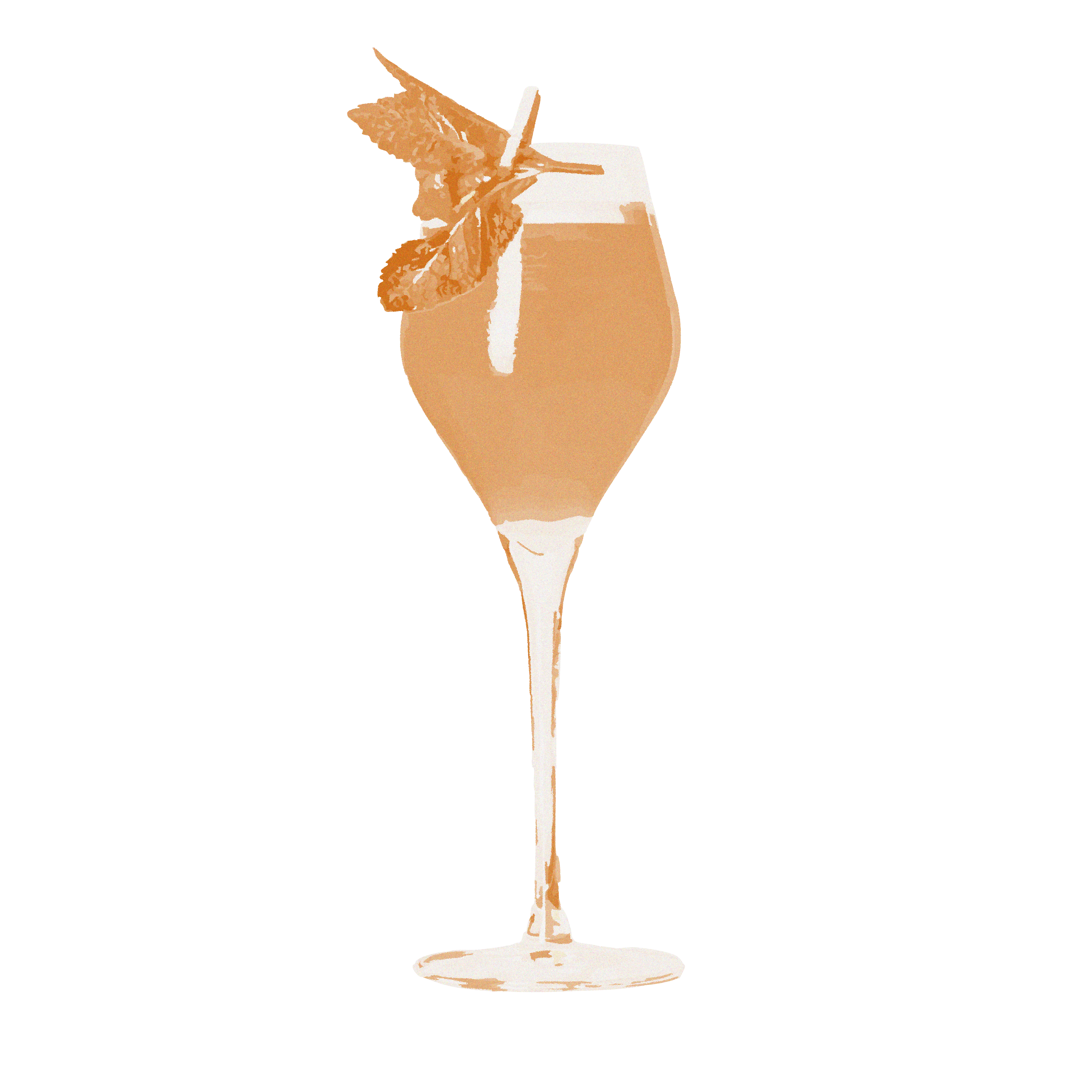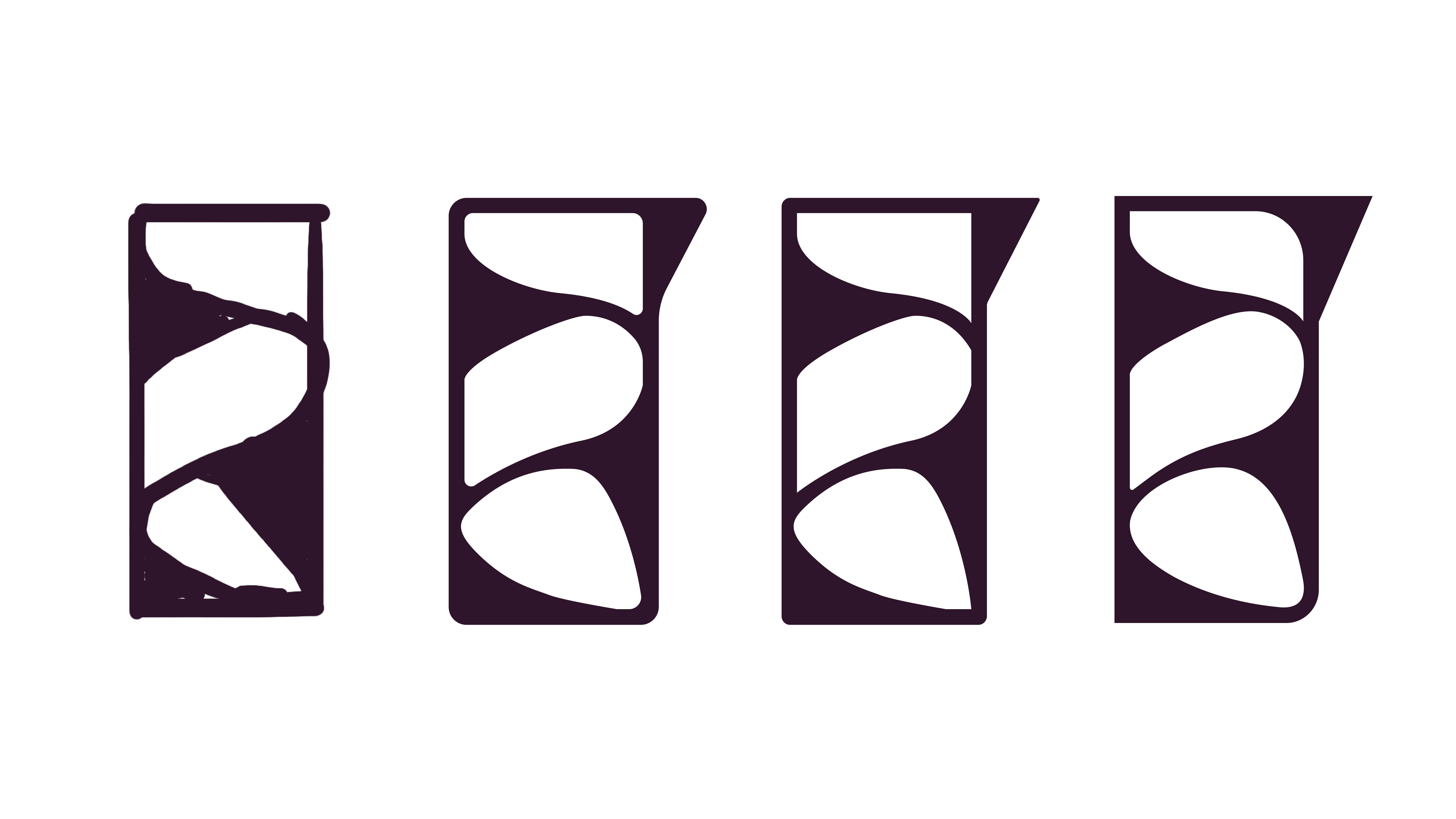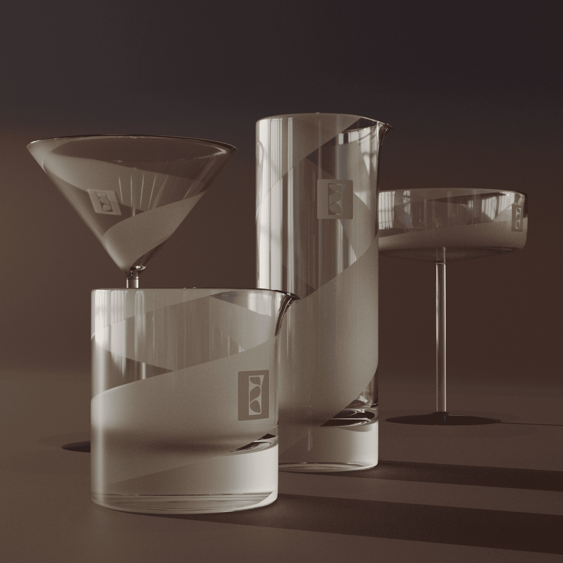 A refined mark that layers the combined silhouette of a beaker and mixing glass with an elegant yet dynamic twist of citrus peel. The combination of sharp and round shape language mimic the uncommon combination of cocktails and scientific thinking.